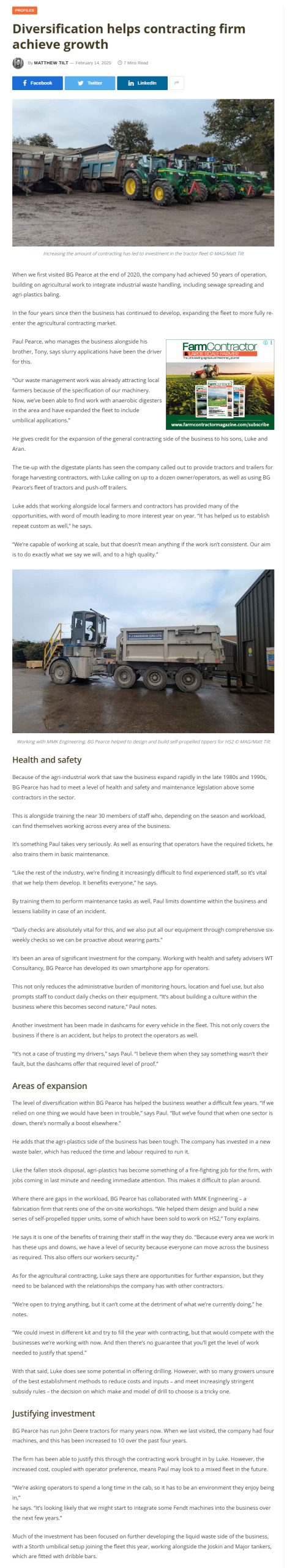 News Please check out an editorial about BG Pearce by the Farm contractor and large scale operator magazine!! https://www.farmcontractormagazine.com/profiles/diversification-helps-contracting-firm-achieve-growth.html